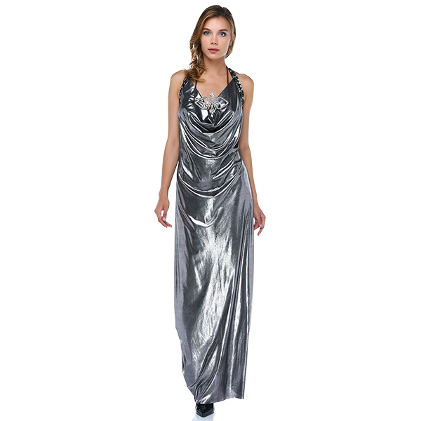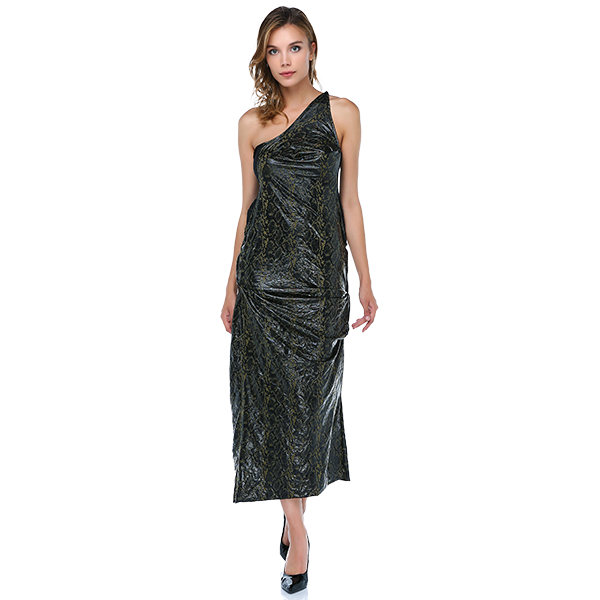 Taşlı yılan zincir detaylı iki tarafı komple açık dekolte elbise