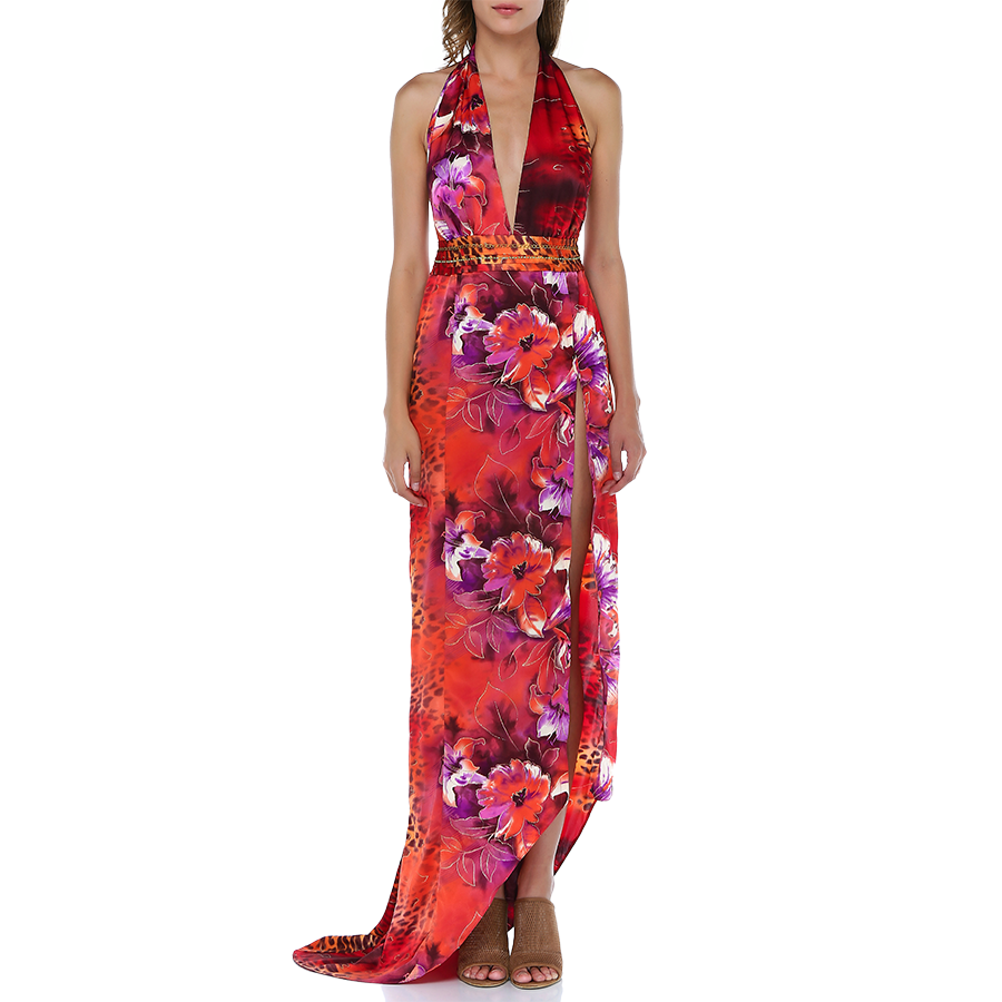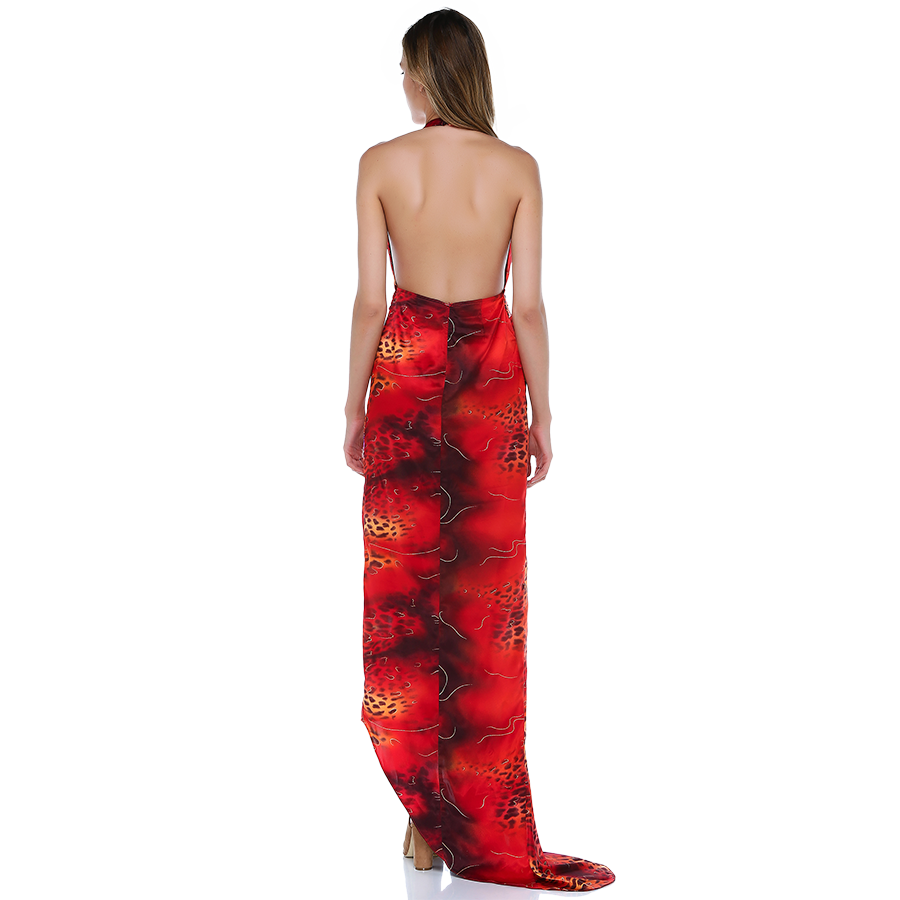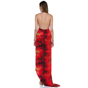 Kasık bölgesi dekolteli, el işlemesi zincirli yırtmaçlı ipek saten elbise