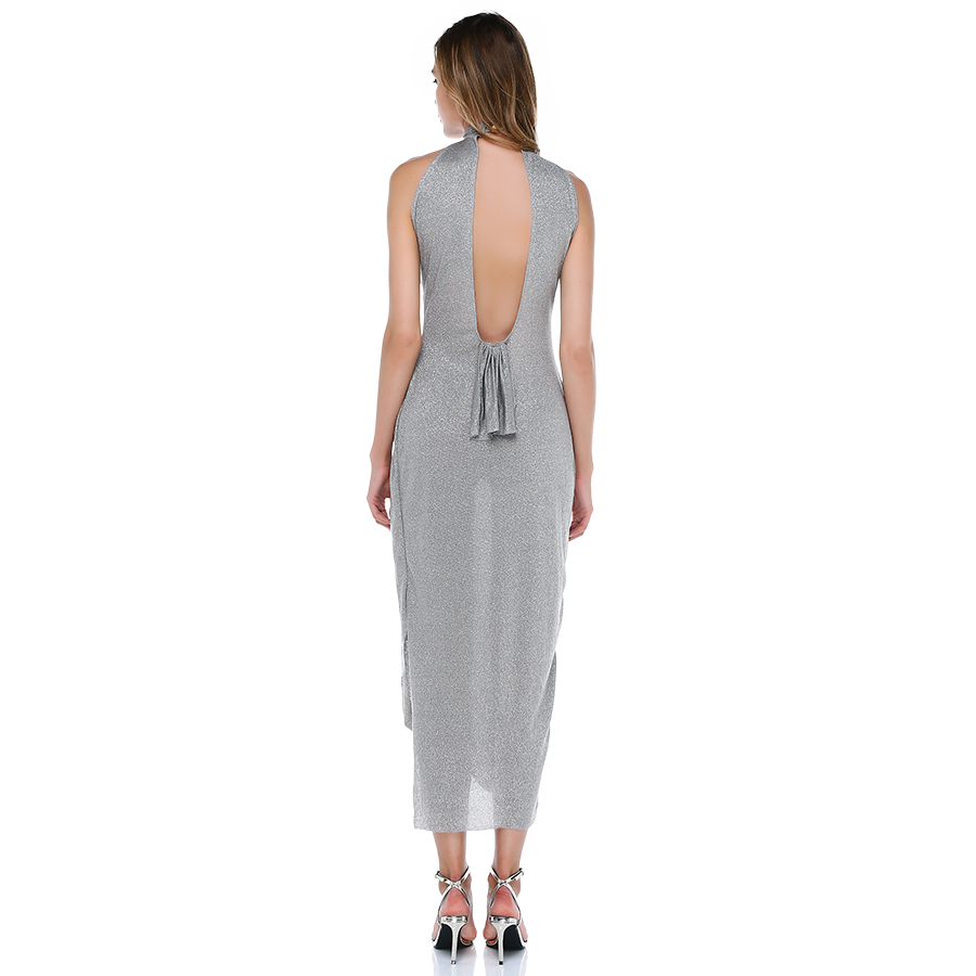 Parlak kumaş boyundan bağlı sırtı açık elbise